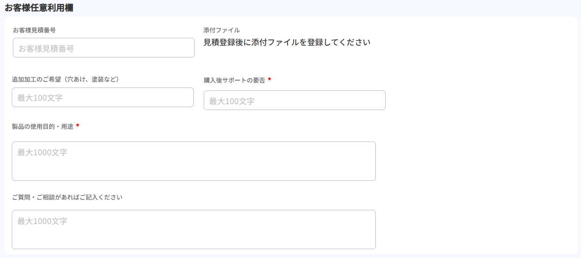 | ご要望事項記入欄 ※上の画像内の以下項目 ・追加加工のご希望(穴あけ、塗装など) ・購入後サポートの要否 ・製品の使用目的・用途 ・ご質問・ご相談があればご記入ください | 会員のご要望事項を登録できます。 なお、記入欄は最大 20 件(単一行 15 件、複数行 5 件)用意でき、 各記入欄の名称、必須/任意、会員への表示/非表示は、設定により変更できます。 サイドメニュー>設定>店舗設定-注文・見積へ進み、「ご要望事項記入欄」で設定してください。 ※上の画像は、単一行の記入を 2 件、複数行の記入欄を 2 件表示した場合のイメージです。 | 会員のご要望事項がある場合は、入力してください。 記入欄の設定変更が必要な場合は、見積登録前に実施してください。 |