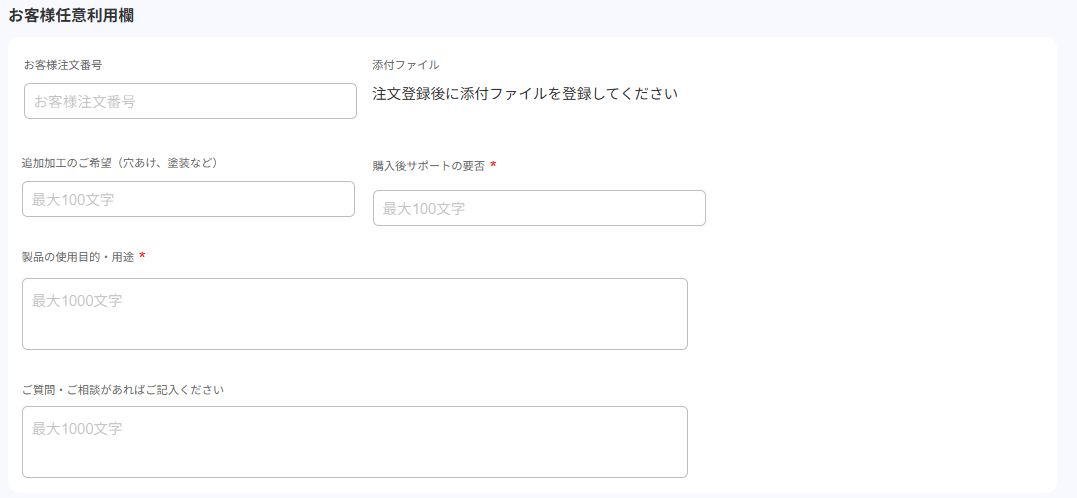 | ご要望事項記入欄 ※上の画像内の以下項目 ・追加加工のご希望(穴あけ、塗装など) ・購入後サポートの要否 ・製品の使用目的・用途 ・ご質問・ご相談があればご記入ください | 会員のご要望事項を登録できます。 なお、記入欄は最大 20 件(単一行 15 件、複数行 5 件)用意でき、 各記入欄の名称、必須/任意、会員への表示/非表示は、 設定により変更できます。 サイドメニュー>設定>店舗設 定-注文・見積へ進み、 「ご要望事項記入欄」で設定してください。 ※上の画像は、単一行の記入を 2 件、 複数行の記入欄を 2 件表示した場合のイメージです。 | 会員のご要望事項がある場合は、入力してください。 記入欄の設定変更が必要な場合は、 注文登録前に実施してください。 | 初期状態では、見積時に登録した内容が表示されます。 記入欄の設定変更が必要な場合は、 注文登録前に実施してください。 |