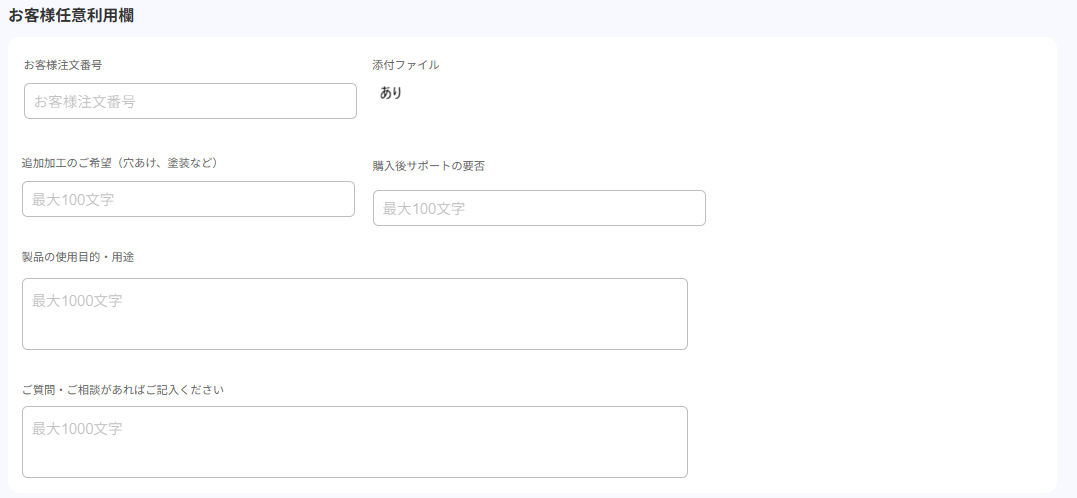 | ご要望事項記入欄 ※上の画像内の以下項目 ・追加加工のご希望(穴あけ、塗装など) ・購入後サポートの要否 ・製品の使用目的・用途 ・ご質問・ご相談があればご記入ください | 会員のご要望事項を登録できます。 なお、記入欄は最大 20 件(単一行 15 件、複数行 5 件)用意でき、 各記入欄の名称、必須/任意、会員への表示/非表示は、設定により変更できます。 サイドメニュー>設定>店舗設定-注文・見積へ進み、「ご要望事項記入欄」で設定してください。 ※上の画像は、単一行の記入を 2 件、複数行の記入欄を 2 件表示した場合のイメージです。 |