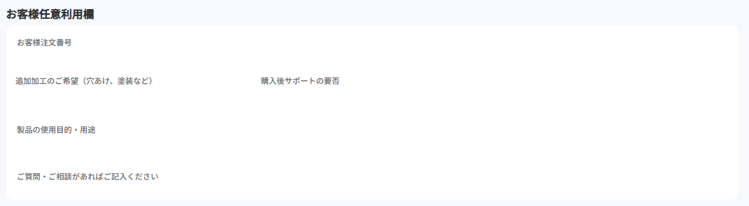 | ご要望事項記入欄 ※上の画像内の以下項目 ・追加加工のご希望(穴あけ、塗装など) ・購入後サポートの要否 ・製品の使用目的・用途 ・ご質問・ご相 談があればご記入ください | 会員からのご要望事項です。 | 記入欄は、店舗設定-注文・見積で用意したものが表示されます。 最大 20 件(単一行 15 件、複数行 5 件)用意できます。 ※上の画像は、単一行の記入を 2 件、複数行の記入欄を 2 件表示した場合のイメージです。 |