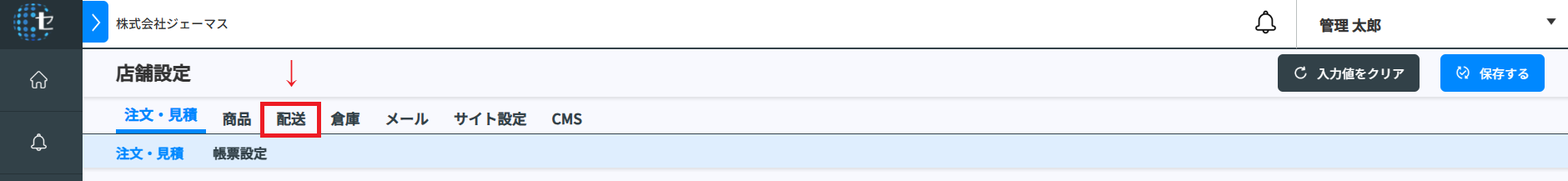 サイドメニュー店舗設定店舗設定-注文見積より、遷移タブ「配送」をクリックして、店舗設定-配送に進みます。