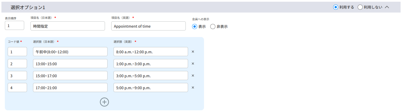 選択肢(日本語)/選択肢(英語)各選択肢の名称を入力してください。日本語と英語のそれぞれで登録できます。