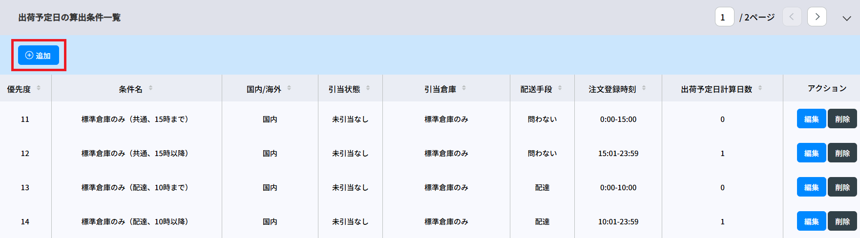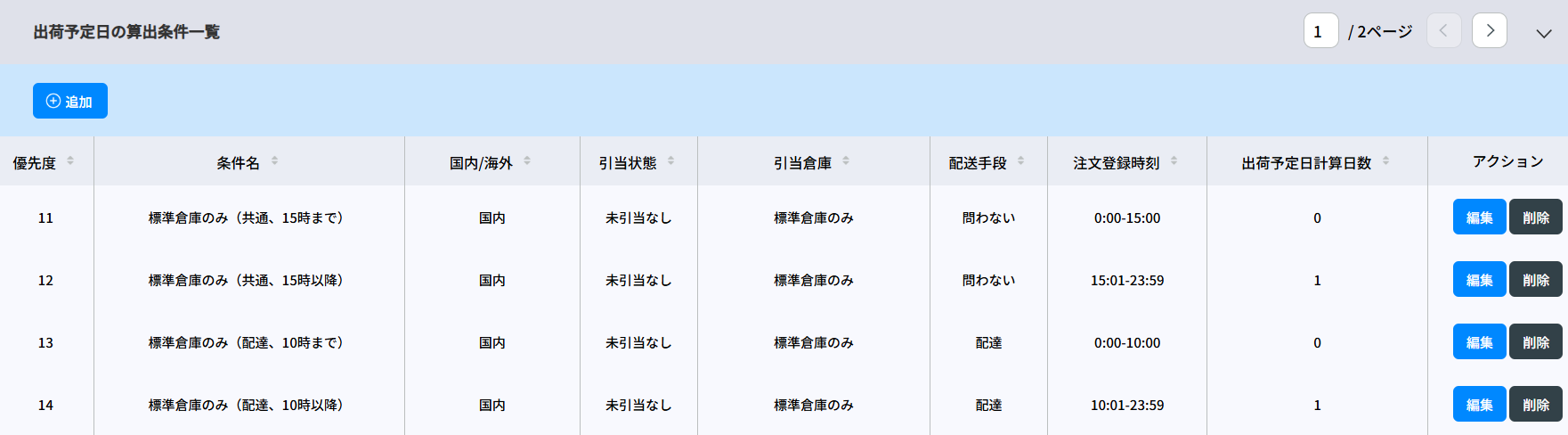 店舗設定-配送画面の出荷予定日の算出条件一覧に移動します。