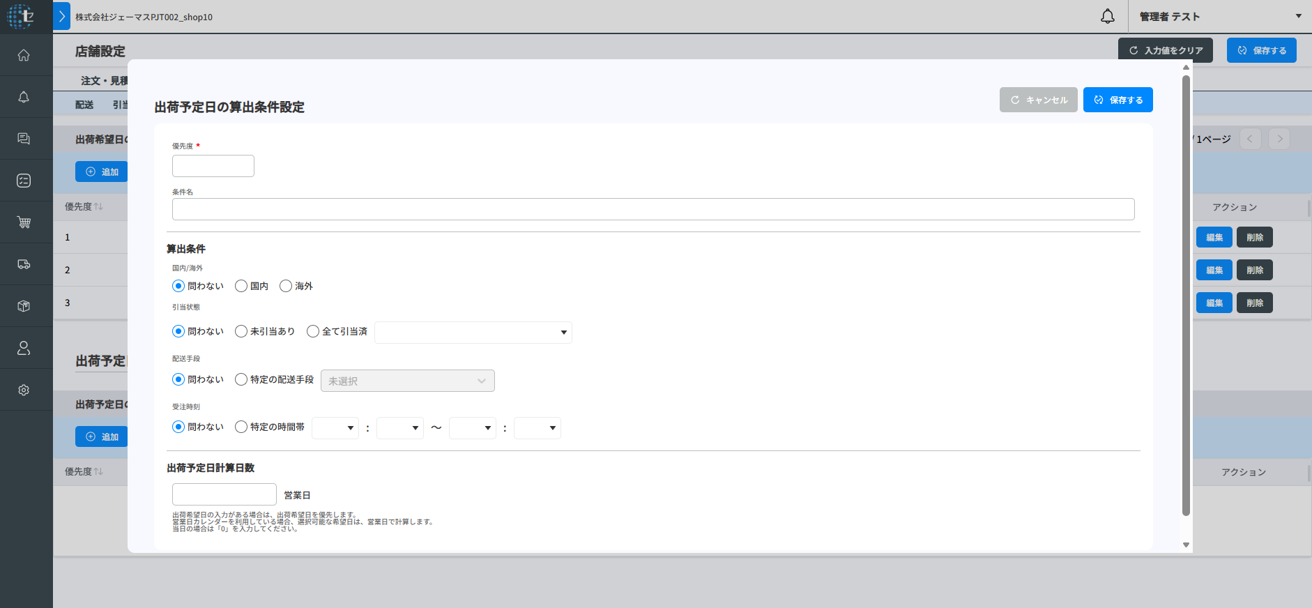 出荷予定日の算出条件の編集が終わり、保存する場合は、ダイアログ内右上にある「保存」ボタンをクリックしてください。