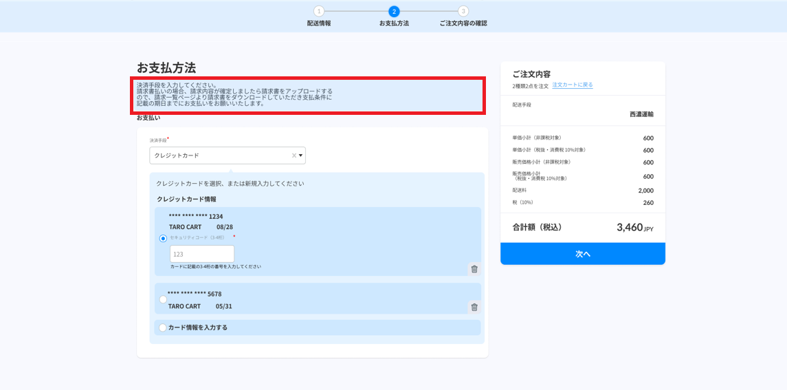 支払方法選択画面 ※タイトル下部会員が注文登録する際に、支払方法を選択する画面があります。