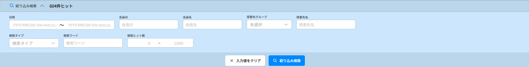 各項目を入力・選択することで、得意先、会員、検索タイプ、検索ワード、ヒット数条件の設定ができます。