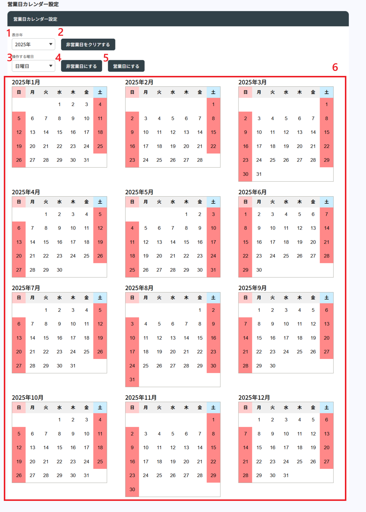 4. 非営業日にするクリックすると、「操作する曜日」で選択された曜日が非営業日となり、カレンダー上で赤色になります。