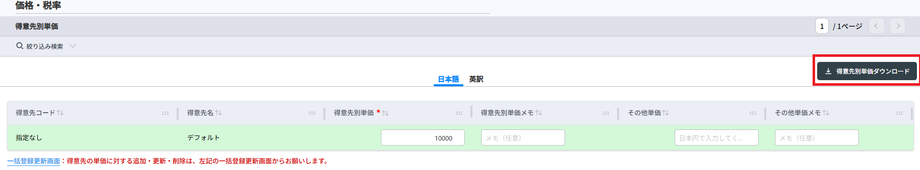 商品の詳細画面内「得意先別単価」タブにある、「得意先別単価ダウンロード」ボタンをクリックします。