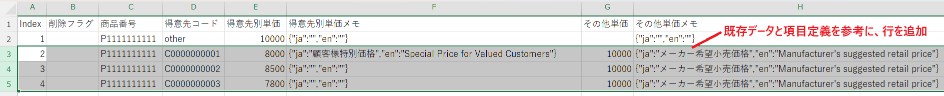 ダウンロードした CSV ファイルに行を追加する形で、得意先別単価のデータを作成します。