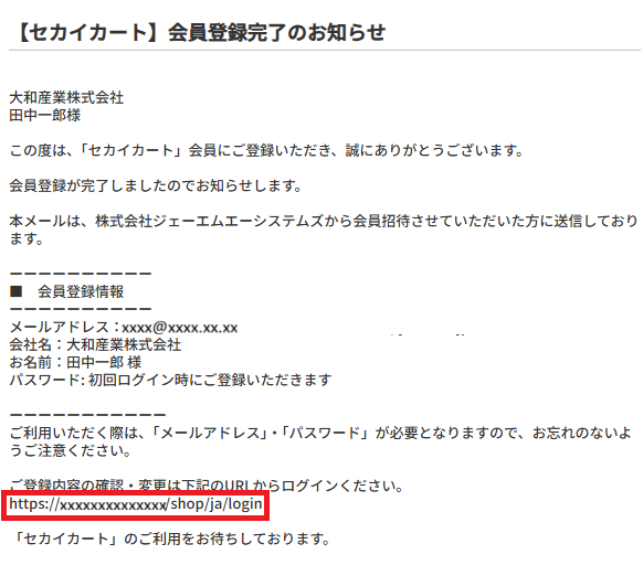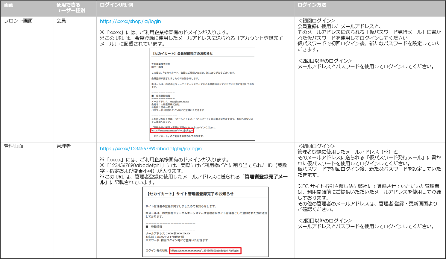 | 会員がログインする EC サイトの URL はどこで確認できますか? | 会員登録を行うと、登録時に使用したメールアドレスに「アカウント登録完了メール」が送られます。 そのメールに URL が記載されています。 ![]() |