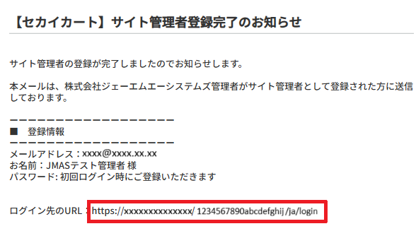 | 管理画面 | 管理者 | https://xxxxx/1234567890abcdefghij/ja/login ※「xxxxx」には、ご利用企業様固有のドメインが入ります。 ※「1234567890abcdefghij」には、実際にはご利用様ごとに割り当てられた ID(英数字・指定および変更不可)が入ります。 ※この URL は、管理者登録に使用したメールアドレスに送られる 「管理者登録完了メール」に記載されています。 ![]() | 管理者登録に使用したメールアドレス(※)と、 そのメールアドレスに送られる「仮パスワード発行メール」に書かれた仮パスワードを使用してログインしてください。 ※EC サイトお引き渡し時に弊社にて登録させていただいた管理者は、 利用開始前にご提供いただいたメールアドレスを使用して登録しております。 その他の管理者のメールアドレスは、管理者 登録・更新画面よりご確認ください。 |